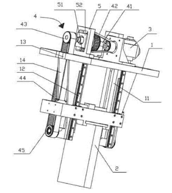 所述的机座 1 向下延伸出支架 11 ,所述的支架 11 上设有导轨 12 ,所述的安装架 21 上设有与导轨 12 相适配的导滑块 211 。当然在实际生产加工过程中也可以在安装架上设置导轨,在机座上设置滚轮或者导滑块。当然在实际生产过程中,也可以设置滑槽与滚轮的配合方式。所述的机座 1 上设有供同步带 44 穿过的缺口 13 。所述的支架 11 有两只,每只支架 11 上均设有两块加强板 14 ,所述的两块加强板 14 与同步带 44 间隔设置。本发明中,导轨可以设置在加强板上。两块加强板将环形同步带的竖直部间隔开,使得产品运行平稳。同时设置四根导轨使得本发明上升和下降中运行平稳可靠,同步性好。