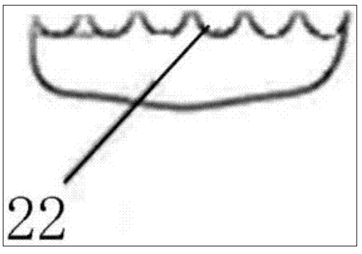 如图2所示,挡板61底部连接回流管A 88,回流管A 88接入回料罐 8中,喷出的多余喷涂液通过回流管88返回至回料罐 8中,实现喷涂液的回收利用;回料罐 8通过转子泵81与出料管A86连接,出料管A86接入工作罩5内部的出料枪23,转子泵81将回料罐8内的喷涂液通过出料管A86泵送至出料枪23中,出料枪23出料口对准喷胶盘2的正中圆心位置,出料枪23对着喷胶盘2中间进行喷胶,当喷胶盘2转动时,喷涂液沿着径向被均匀地甩出,到达喷胶盘2边缘的沟槽22,如图6所示,沟槽22由等距的U型槽组成,这种结构可以确保喷涂液在甩出时是等量切均匀的,防止纸张产生痕迹,造成不良影响。