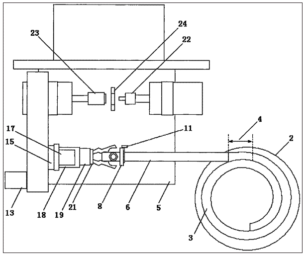 挡件闸板9下落后,处于上方的机械手在升降气缸17的推动下下移,手指气缸21动作使其上的手指平行张开将管件夹紧,然后在升降气缸17的拉动下提升到合适高度,随之伺服电机13启动,通过同步带16的运转带动夹有管件的机械手平移到加工位上方,旋转气缸19带动手指气缸21旋转90°,使手指气缸21夹着管件的手指垂直朝下,管件与固定卡具24处于同轴状态,此时升降气缸17再次推动机械手下移,使管件进入固定卡具24内被卡紧,手指气缸21动作使其上的手指张开松开管件,随之在升降气缸17的拉动下机械手上移,旋转气缸19带动手指气缸21反向旋转90°,使手指气缸21的手指还原到水平状态,再由伺服电机13带动同步带16使机械手横移到取件位置的上方,被卡紧在固定卡具24内的管件由内丝攻丝头22、外丝攻丝头23从两头同时旋转进刀完成管件两头内、外螺丝的加工。