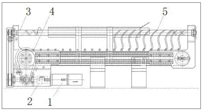 图中:1、伺服马达;2、传动齿轮箱;3、上部丝杆输送装置;4、下部同步带输送装置;5、带端子的线束。