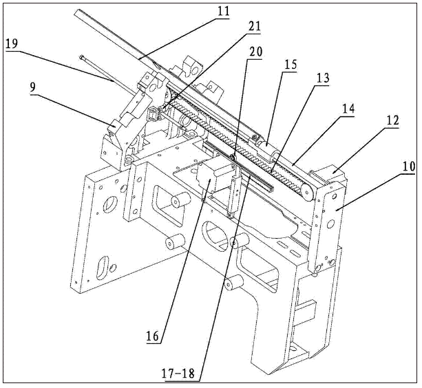 如图2所示,本实施例剪刀驱动机构由步进电机16连接齿轮17驱动,通过齿轮转动,齿条18移动实行剪刀驱动。齿条与剪刀之间有连杆19连接,齿条17与连杆19各有导轮20和轴承21定位。