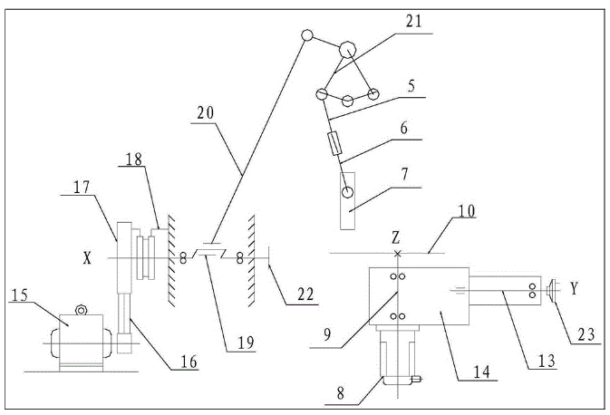 1、主传动(X轴的运动):由一般异步电机15通过三角皮带16带动飞轮17,再由起控制作用的离合制动器18驱动曲轴19再带动推拉杆20推拉摆杆21摆动,通过摆杆21带动连杆5、球头螺杆6和滑块7上下运动。