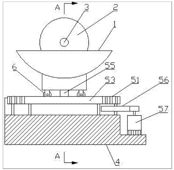 作为上述方案的进一步改进,所述碾槽1滚动设置在底座4上,具体的,碾槽1底部设有滚轮6,滚动移动的方式阻力小,对电机57的功率、连接块55与第一同步带51的连接强度等要求降低。