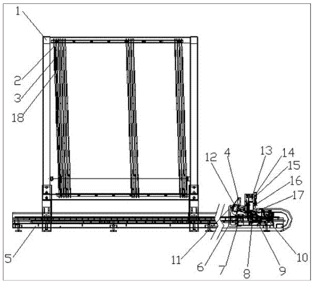 如图1所示,本具体实施方式采用以下技术方案:它包含网格架1和底部梭车4,所述的网格架1是由分隔棒2和套管3组成,套管3套在分隔棒2的外面,分隔棒2与地面成一定角度固定在网格架1的框架上,多根同平面上的分隔棒2形成一个库位用于存放一层产品,产品18斜立在网格架1下沿同时侧面靠在分隔棒2外的套管3上,多个库位组成一个网格架1单元;所述的底部梭车4是由底部骨架5、直线滑轨6、直线滑块7、齿条8、齿轮9、伺服电机10、梭车骨架11、第一气缸12、输送机骨架13、滚轮14、传感器15、第二气缸16和电机17组成,直线滑轨6固定在底部骨架5上,直线滑块7固定在梭车骨架11上,直线滑轨6和直线滑块7滑动配合,伺服电机10固定在梭车骨架11上,伺服电机10通过同步带轮和同步带连接到齿轮9,齿轮9与齿条8相互啮合,启动伺服电机10使齿轮9旋转带动梭车骨架10沿底部骨架5移动,滚轮14通过轴承固定在输送机骨架13上,输送机骨架13通过铰链固定在梭车骨架11上,第一气缸12通过铰链固定在梭车骨架11上,输送机骨架13通过铰链与第一气缸12连接在一起,启动第一气缸12可推动输送机骨架13摆动运动,输送机骨架13通过摆动来改变滚轮14顶面与网格架下沿的高度,当滚轮14顶面高于网格架下沿时可旋转滚轮14,产品18侧面由隔套3支撑底部由滚轮14驱动移行完成输入或输出动作,当滚轮14顶面低于网格架下沿时可将输入到位的产品18摆放到网格架下沿上完成存储动作,传感器15固定在第二气缸16上,第二气缸16与输送机骨架13固定在一起,当滚轮14顶面高于网格架下沿进行输入或输出操作时第二气缸16伸出使传感器15高于滚轮14顶面进行产品18的检测,当滚轮14顶面低于网格架下沿进行横移操作时第二气缸16缩回使传感器15低于滚轮14顶面避免碰撞,电机17固定在输送机骨架13上,电机17通过同步带轮和同步带与滚轮14连接,启动电机17可驱动滚轮14旋转完成产品18的输入或输出功能。