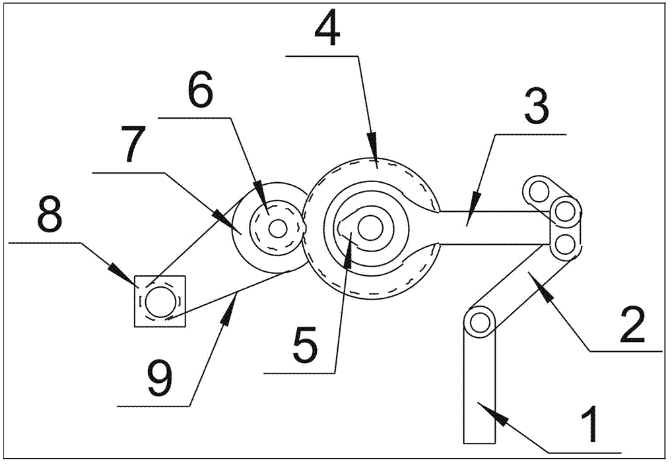 图中,1、滑块;2、连接杆;3、连杆;4、主齿轮;5、主驱动曲轴;6、减速齿轮;7、同步带轮;8、伺服电机;9、皮带。
