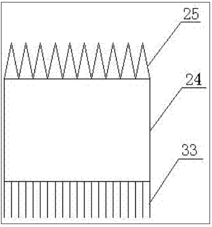 图中:1、粉碎仓,2、研磨仓,3、盖板,4、粉碎辊,5、粉碎齿,6、进料口,7、研磨板,8、螺杆,9、同步轮,10、滑块,11、同步带,12、电机,13、气缸A,14、支撑块,15、研磨辊,16、滑杆,17、导杆,18、滑板,19、气缸B,20、出料斗,21、磁铁,22、磁性块,23、收纳盒,24、梳理板,25、梳理齿,26、挂环,27、挂钩,28、连接绳,29、转轴,30、卷轴,31、涡卷弹簧,32、空腔,33、刷毛,34、挡板,35、弧形面,36、活动门。