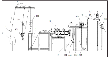 其中:1-机架;2-纠偏纵切装置;201-支撑架;2031-伺服电机;2033-第一转轴;2034-第二转轴;2035-滚轮;204-追边纠偏装置;2041-四指拨边器;2042-布边追踪传感器;205-针板同步带组件;2052-针板;2053-同步带;2054-同步带轮;2055-针板连接板;2061-毛轮;207-纵切刀组件;2081-脱布带;2082-上支撑;2083-压布辊;2084-脱针支撑;2085-右导向支撑;2086-张紧脱布支撑;2087-左导向支撑;3-放布装置;401-吸边器;402-红外对中装置;501-连续牵引出布装置;502-落布槽;6-横切装置;602-间歇牵引出布装置;603-横切刀组件;7-待裁布料;8-张力保持装置;801-张力调整辊;802-张力调整辊配重;803-导向光轴;9-导布辊;10-开幅辊。