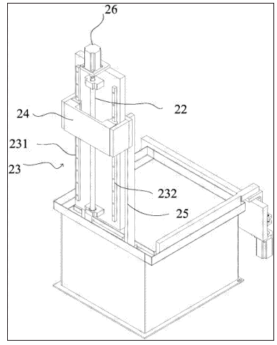 升降机构2用于带动工作台3作Z轴升降,其包括:Z轴基板21、丝杠副22、第二导轨滑块23,以及第二连接板24,所述Z轴基板21垂直固定连接于树脂槽4后上方,丝杠副22和第二导轨滑块 23纵向固定连接于所述Z轴基板21后端面,所述第二连接板24与所述Z轴基板21套设连接,并且第二连接板与丝杆螺母固定连接,第二连接板24与第二导轨滑块23成滑动配合连接,在所述第二连接板24前端面还连接一组吊柱25,所述吊柱25垂直向下延伸一直连接于工作台3的后端面, Z轴电机26旋转经丝杠副22传动带动第二连接板24,进而拉动吊柱25以带动工作台3作升降运动。