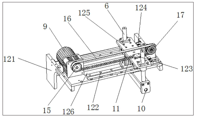 如图3所示,进一步的,X方向同步带驱动机构12还包括主动皮带轮15、传动皮带16、从动皮带轮17、X方向滑轨122、X方向移动块123、X方向滑动座124、X方向滑动槽126;其中,X方向碾碎驱动电机9的输出轴上安装有主动皮带轮15,X方向滑动架125的上方设置有从动皮带轮17,主动皮带轮15与从动皮带轮17之间通过传动皮带16传动连接,X方向滑动架125的上方与传动皮带16对应的位置设置有X方向移动块123,X方向移动块123通过螺栓固定安装在X方向滑动架125上,传动皮带16穿过X方向移动块123,且传动皮带16与X方向移动块123之间通过传动齿啮合连接,X方向安装座121的中间位置设置有X方向滑动槽126,X方向滑动槽126的两侧设置有X方向滑轨122,X方向滑动架125的下方与X方向滑轨122对应的位置设置有X方向滑动座124,X方向滑动架125与X方向安装座121之间通过X方向滑轨122和X方向滑动座124滑动连接,X方向下压气缸11位于X方向滑动槽126的内部。