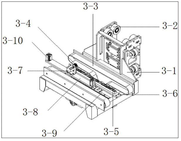 参看如图1-图4所示,本具体实施方式包含地车1、立柱2、货叉机构件3、地轨4、天轨5,其中,天轨5设在地轨4上方,且与地轨平行,地车1滑动架设在地轨4上,立柱2竖直固定设置在地车1上,立柱2上端与天轨5滑动设置,货叉机构件3滑动架设在立柱2上;所述的地车1包含车身焊接件1-1、主动轮1-2、从动轮1-3、行走电机1-4、数个一号导轮1-5,其中,主动轮1-2与从动轮1-3分别设置于车身焊接件1-1两端,且均滑动设置在地轨4上,一号导轮1-5设置在车身焊接件1-1侧面,且紧贴地轨4侧面,行走电机1-4固定设置在车身焊接件1-1设置有主动轮1-2的一端,且行走电机1-4输出轴穿设在主动轮1-2上;所述的立柱2还包含升降电机2-1、升降轨道2-2、同步带2-3、转轴2-4,其中,转轴2-4旋接在立柱2两端,转轴2-4上绕设有同步带2-3,升降轨道2-2设置在立柱2侧面靠近同步带2-3的一侧,且升降轨道2-2与同步带2-3平行,升降电机2-1固定设置在立柱2下端,且升降电机2-1输出轴穿设在转轴2-4上;所述的货叉机构件3包含“L”形支架3-1、数个二号导轮3-2、数个链轮3-3、齿轮3-4、齿条3-5、齿条固定件3-6、移动电机3-7、滑动块3-8、滑轨3-9、数个气缸3-10,其中,支架3-1背面旋接有二号导轮3-2,二号导轮3-2架设在升降轨道2-2上,支架3-1背面与同步带2-3固定连接,滑轨3-9固定设置在支架3-1上,滑动块3-8架设在滑轨3-9上,移动电机3-7固定设置在滑动块3-8上,移动电机3-7输出轴上穿设有齿轮3-4,滑动块3-8两端均固定设置有气缸3-10,齿条固定件3-6固定设置在支架3-1上,齿条3-5固定设置在齿条固定件3-6上,齿轮3-4与齿条3-5咬合,链轮3-3分数组旋接在支架3-1上,滑动块3-8、气缸3-10及链轮3-3上方放置有产品。