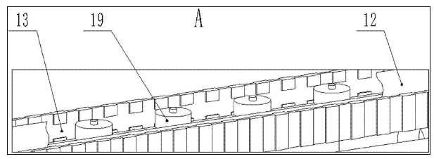 X向驱动模块2包括上支架A12、下支架A16和前后两个对称分布的同步带驱动装置A以及导轨滑块装置组成。在平台支撑模块的导轨C上滑动连接滑块C14,滑块C上部通过螺钉固定在水平的机架上。在上支架A和下支架A之间通过螺钉连接,上支架A主体为“匚”形结构,并在左侧一端设有2个圆环形板状结构,用于安装同步带轮A,中部为厚度小于同步带厚度的长条形结构,并在其上设有一排用于安装压紧轮的圆形安装孔。所述的下支架A主体为“口”字形结构,其四周设有4个圆环形结构,用于安装同步带A11和同步带轮B17,中部为厚度小于同步带厚度的长条形结构,并在其上设有一排用于安装压紧轮的圆形安装孔,上支架A和下支架A之间通过螺钉相固定连接。压紧轮A19安装在上支架A、下支架A之间的安装槽中。同步带驱动装置A主要由电机A18、同步带轮A、同步带轮B、同步带A13以及压紧轮A组成。两个电机A的输出端分别插接在一个同步带轮B上,一个同步带轮B对应于与一个同步带轮A之间通过同步带A相连,压紧轮A压紧同步带A保证同步带与动平台的同步带轮紧密啮合。同步带A外侧为带有全齿的同步带形式,内侧带宽的上下两侧设计有与外侧齿型相同的同步带齿,中间处为设有带齿的光带形式。