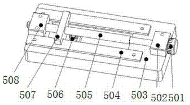 构成如6所示,所述皮带张紧装置106包括基座503,基座503上设有经螺栓固定件502、508设有长螺栓505,长螺栓505的一端设有张紧旋钮501,长螺栓505上设有张紧螺母507,张紧螺母507的两侧设有防转片504,张紧螺母507上连接有张紧拨动杆506,张紧拨动杆506与皮带涨紧轮107连接。手旋动张紧旋钮可使得长螺栓带动张紧螺母做类似于滚珠丝杆的直线运动,而张紧拨动杆又固定在张紧螺母上,所以通过旋转张紧旋钮可以使得张紧拨动杆拨动皮带涨紧轮对同步带进行张紧。