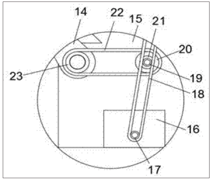 图中:1机体、2储存腔、3支撑架、4滑轨、5滑块、6螺纹杆、7第二电机、8固定块、9钻机、10限位杆、11钻头、12通道、13粉碎腔、14偏心轮、15架体、16第一电机、17第四齿轮、18第二同步带、19第三齿轮、20第二齿轮、21转动轮、22第一同步带、23第一齿轮。