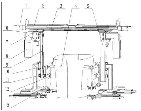1-伺服电机一;2-支架;3-丝杠;4树脂模-;5-移动支架;6-主动同步带轮;7-减速机;8-伺服电机二;9-同步带;10-矫正气缸支架;11-从动同步带轮;12-翻转支架;13-气缸。