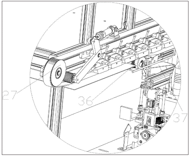 进一步的,所述第二同步带机构包括第一传输滚轮30、传送带3、第二传输滚轮31、第一传输轴32、第二传输轴33、第四传输滚轮34、第五传输滚轮35、第六传输滚轮36和第二同步带37;所述第一传输滚轮30设置在第二转轴6上;所述第一传输滚轮30通过传送带3与第二传输滚轮31相连,第二传输滚轮31设置在第一传输轴32上,第一传输轴32和第二传输轴33相连;所述第四传输滚轮34设置在第二传输轴33上;所述第四传输滚轮34、位于第四传输滚轮34上方的第五传输滚轮35以及位于第四传输滚轮34前端的第六传输滚轮36之间通过第二同步带37相连,且第二同步带37位于第一同步带26下方。