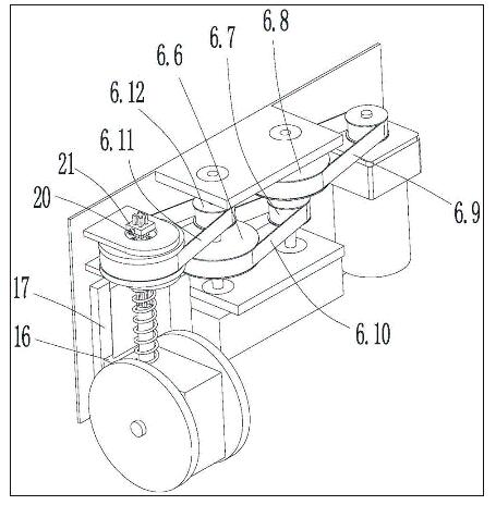 所述同步带减速系统6包括水平安装在安装基板1上的竖直支架三6.1和竖直支架四6.2,所述竖直支架三6.1位于竖直支架四6.2上部,所述竖直支架三6.1和竖直支架四6.2上通过轴承6.3从左到右安装有过渡轴一6.4和过渡轴二6.5,所述过渡轴一6.4上固联有同步轮四6.12和同步轮三6.6,所述过渡轴二6.5上固联有同步轮二6.7和同步轮一6.8,所述同步轮四6.12的圆周直径小于同步轮五7,所述同步轮四6.12的圆周直径小于同步轮三6.6,所述同步轮三6.6的圆周直径大于同步轮二6.7,所述同步轮二6.7的圆周直径小于同步轮一6.8,所述同步轮一6.8的圆周直径大与主动轮5,所述主动轮5通过同步带一6.9与同步轮一6.8相连,所述同步轮三6.6和所述同步轮二6.7通过同步带二10相连,所述同步轮四6.12和所述同步轮五7通过同步带三6.11相连,这样,因为每根同步带后面的同步轮圆周直径大于前面的同步轮,因此可以达到力矩放大的作用。