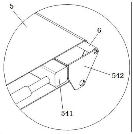 其中,承托板54一端固定安装固定板541;固定板541一侧面并排安装 U形支架542;U形支架542的侧壁有一斜边;两侧壁间斜边上下两端分别转动安装小轴6;位于斜边上端的若干小轴6同轴心构成上固定轴;位于斜边下端的若干小轴6同轴心构成下固定轴。