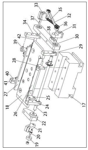 所述模盒8包括模盒底板18、轴承19、摆臂121、左固定支架22、小轴123、摇杆124、左支座125、模盒侧板左26、模盒侧板右27、左支座228、摇杆229、中间固定支架30、摇臂231、连杆32、摇臂333、摇杆334、拉簧35、挡块38、右支座239、右支座140、摇杆441、小轴242、右固定支架43;
